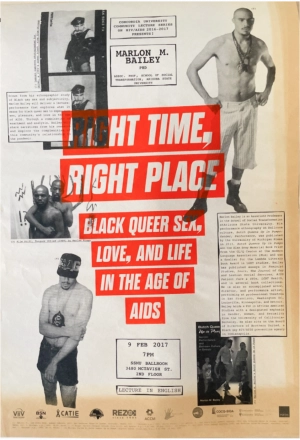 L’affiche sur un fond jauni comporte un seul encadré au contour noir disant en lettres majuscules noires « PARC COMMÉMORATIF DES PERSONNES MORTES DU SIDA AU QUÉBEC » et au bas de l’encadré « 1 RUBAN = 1MORT·E »