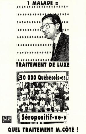 Sur un fond noir texturé, occupant grossièrement les deux tiers supérieurs, un portrait en noir et blanc tramé du ministre de la santé Marc-Yvan Côté; l’identification est en bas à gauche du portrait petits caractères blancs; Deux cornes dessinées y sont superposées dans lesquelles on peut lire « SIDACRA ACRATE » avec un texte disant « MALADE SUR PIED » et « QUEL ENFER ».       Le tiers inférieur présente le texte « EXIGEONS DES MÉDICAMENTS À MOINDRE COÛT POUR LES PERSONNES ATTEINTES DU VIH / SIDA » ainsi que tout en bas au centre Le logo d’ACT UP Montréal et les informations de contact suivantes « COALITION D’ACTION DIRECTE CONTRE LE SIDA | 3600 rue Hôtel-de-Ville Montréal, QC H2X 3B6 téléphone (514) 527·2423 FAX (514) 598·8378